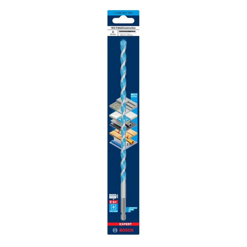 Akár 5x pontosabb, mint a Bosch CYL-3 fúrószár - A modern építkezésen sokféle anyagon kell dolgozni, és soha nem tudni, mit kell majd fúrni legközelebb. A megfelelő fúrószár megtalálása nehéz és időigényes lehet – hacsak nincs kéznél az EXPERT MultiConstruction fúrószár. Ez a rendkívül sokoldalú fúrószár hegyes csúcsának és fejlett geometriai kialakításának köszönhetően megcsúszás nélkül tud pontosan fúrni kemény anyagokba, például gránitba. A finomköszörülési gyártási technikánkkal optimalizált keményfémből készült, így beton, tégla, puha csempe, fa és fém fúrására is alkalmas. Mindig professzionális munkát végez – bármi legyen az anyag. A Bosch EXPERT HEX-9 MultiConstruction fúrószár az egyetlen fúrószár, amelynek mindig a szerszámosládában a helye: you'll never get stuck on a job or waste time looking for the right bit. Hatlapú befogószár az erős csatlakozás és a maximális nyomatékátvitel érdekében, hárompofás tokmányokban és ¼"-os belső hatlapú szerszámtartókban