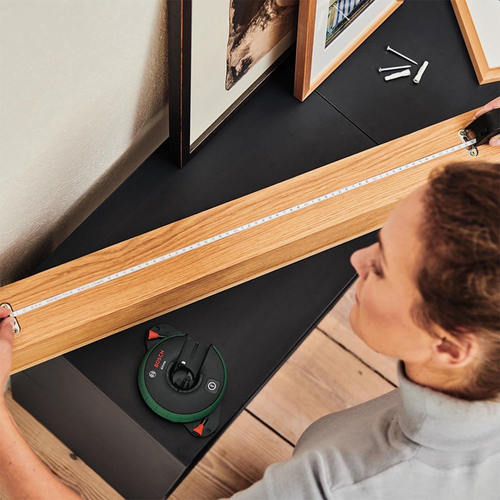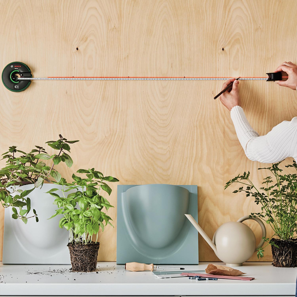 Minden egyben: vonallézer beépített mérőszalaggal az egyszerű rögzítéshez, igazításhoz és méréshez