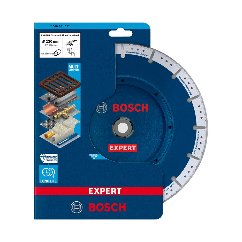 Hosszú élettartam, csövek vágása és leélezése során - Az EXPERT Pipe Cut Wheel a Bosch Diamond Technology megoldását alkalmazza, ami acéltesthez rögzített, optimális minőségű gyémántszemcséket jelent. Ez a szuperkemény él nagyon tartós, és sokféle anyagú csövet képes könnyedén elvágni, az öntöttvastól a kemény műanyagig. Sőt, a kiegészítő leélező kerék automatikusan leélezi a csöveket vágás közben, így idő takarítható meg, és egyszerű módon biztosított a mélységszabályozás is. 22,23 mm-es furattal normál rögzítőanyás sarokcsiszolókhoz
