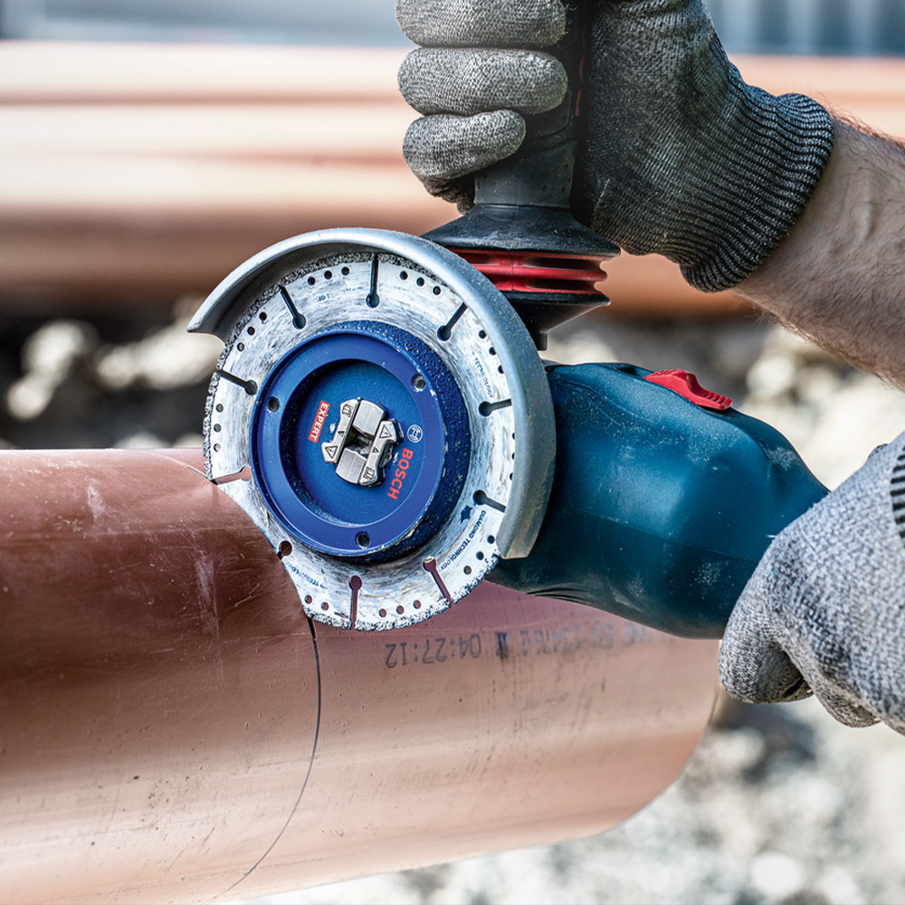 Vágás közben leélezi a csővéget, és hosszabb élettartamú, mint a hagyományos vágótárcsák - A csövek vágásának és leélezésének számos módja van, de a legtöbb időigényes, és még speciális felszerelést is igényel: az EXPERT Diamond Pipe Cut Wheel tökéletes, leélezett vágást tesz lehetővé sarokcsiszolóval – ráadásul ez egy rendkívül tartós kiegészítő. Az EXPERT Pipe Cut Wheel a Bosch Diamond Technology megoldását alkalmazza, ami acéltesthez rögzített, optimális minőségű gyémántszemcséket jelent. Ez a szuperkemény él nagyon tartós, és sokféle anyagú csövet képes könnyedén elvágni, az öntöttvastól a kemény műanyagig. Sőt, a kiegészítő leélező kerék automatikusan leélezi a csöveket vágás közben, így idő takarítható meg, és egyszerű módon biztosított a mélységszabályozás is. Tökéletes kiegészítő a csővágáshoz, nem törik el, ha leesik, nem bocsát ki vegyszerszagot vagy extra port a vágás során, emellett állandó vágási mélységet és sebességet tart fenn a hosszú élettartama során. 22,23 mm-es furattal normál rögzítőanyás sarokcsiszolókhoz