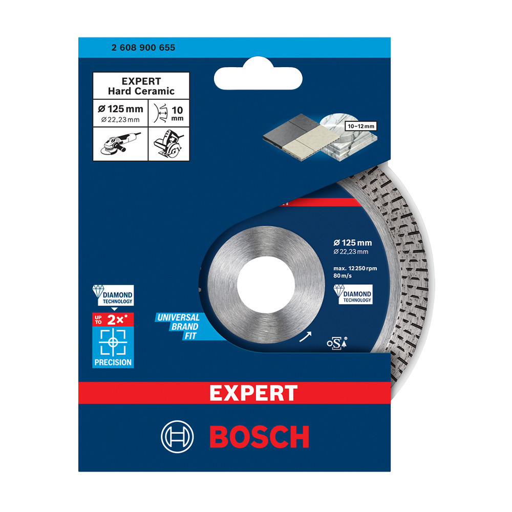 Akár 2x pontosabb, mint a Bosch 2607019473 Ceramic gyémánttárcsák - A modern építőiparban használt csempék gyakran nagyok, nagyon kemények és drágák. Ezért kiemelten fontos és ugyanakkor nagyon nehéz kimagaslóan precízen vágni ezeket. Az EXPERT Hard Ceramic a Diamond Technology mellett számos olyan megoldást alkalmaz, amelyeknek köszönhetően folyamatosan a legjobb eredményt nyújtja, még a legkeményebb csempéknél is. A Bosch Diamond Technology új gyémántokat juttat a felületre a perem állandó élességének biztosítása érdekében, így kerámiavágó-tárcsái a legkeményebb csempéket is könnyedén átvágják. A vékony, de erős test és a folyamatos bordázatú perem maximális kontrollt biztosít, és alacsonyan tartja a vibrációt a minőségi, forgácsmentes vágás érdekében. A Bosch EXPERT Hard Ceramic a legjobb vágást kínálja a kemény csempékben. Gyémánt vágótárcsánkkal biztos lehet benne, hogy minden munka során professzionális felületet kap. 22,23 mm-es furattal normál rögzítőanyás sarokcsiszolókhoz