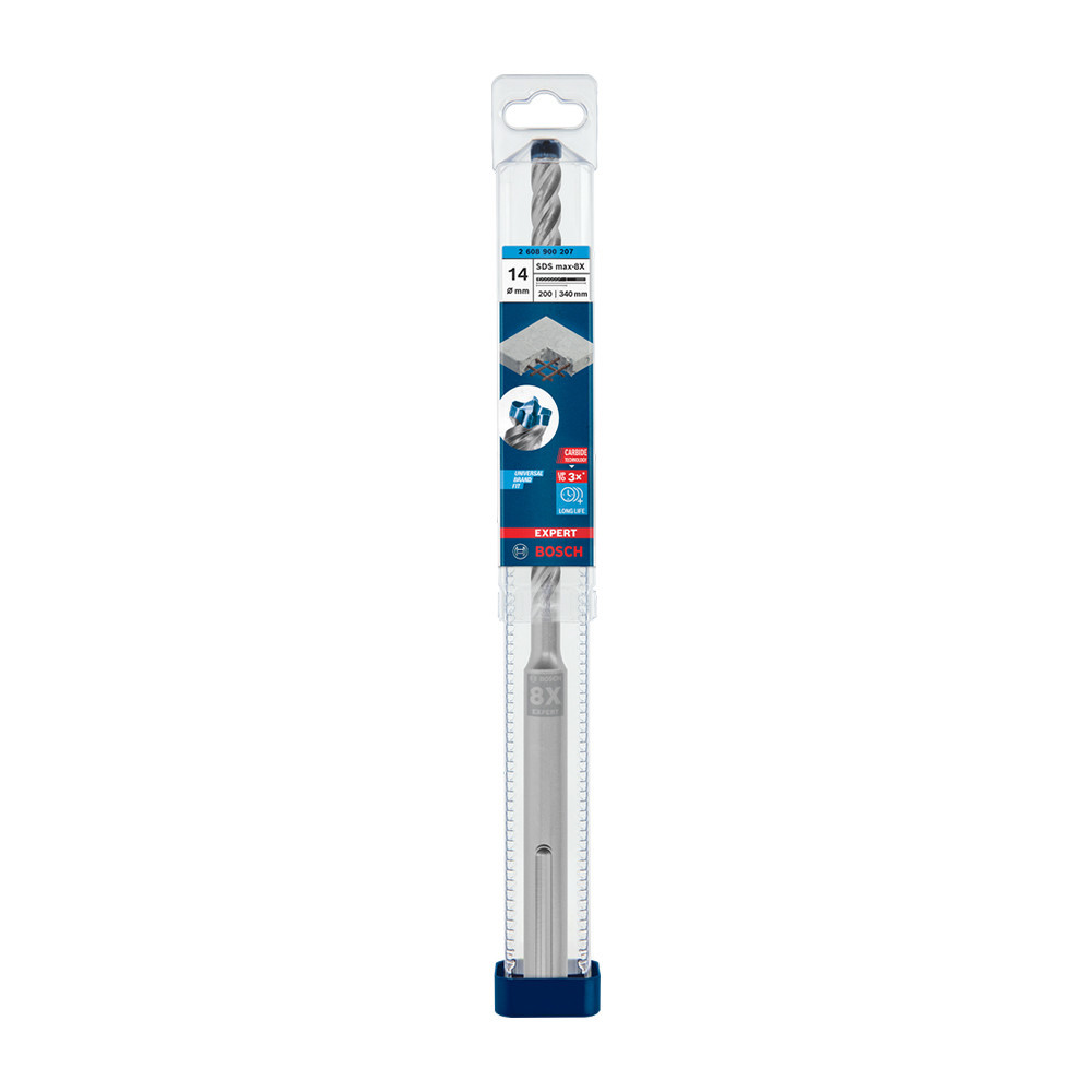 Hosszú élettartam vasbetonnal végzett munka során - A Bosch Carbide Technology és a tömör keményfém fej jóvoltából az EXPERT SDS max-8X típus sokkal tovább bírja, mint a hagyományos kalapácsfúrók. Hatékonyan üti át a betonvasat is, így nincs szükség megállásra, újracélzásra vagy szárcserére, amikor acélt ér. Minden SDS max kalapácsfúróval használható