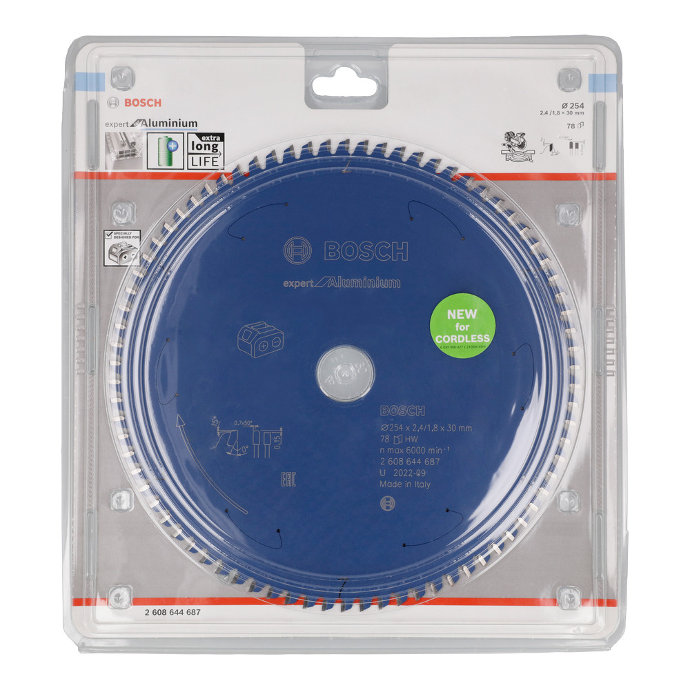 Maximális akkumulátoros üzemidő - Az Expert for Aluminium körfűrészlap a maximálisra növeli az akkumulátoros fűrészek üzemidejét. Extravékony alapteste csökkenti a súrlódást és az anyageltávolítást, kevesebb energiát fogyaszt, továbbá simává és könnyűvé teszi a vágást. A MicroteQ keményfém fogazat kimagasló teljesítményt és hosszú élettartamot garantál a nemvasfémek megmunkálásánál. Alkalmas nemvas fémek, műanyagok, epoxigyanta és akár fa vágására is. A fűrészlap minden elterjedt akkumulátoros gérvágóhoz és sínes gérvágóhoz használható. Az Expert for Aluminium körfűrészlap MicrotecQ fogazata a Bosch saját fejlesztésű, extra finomságú és tartós keményfém fogaival rendelkezik, amely hosszú élettartamot garantál. A fűrészlap korróziógátló ProteQtion bevonata csökkenti a súrlódást, megakadályozza a rozsdásodást, és kimagasló vágási teljesítményt biztosít. Szűkítőgyűrűkkel vagy szűkítőgyűrűk nélkül használható, hogy passzoljon a különböző méretekhez