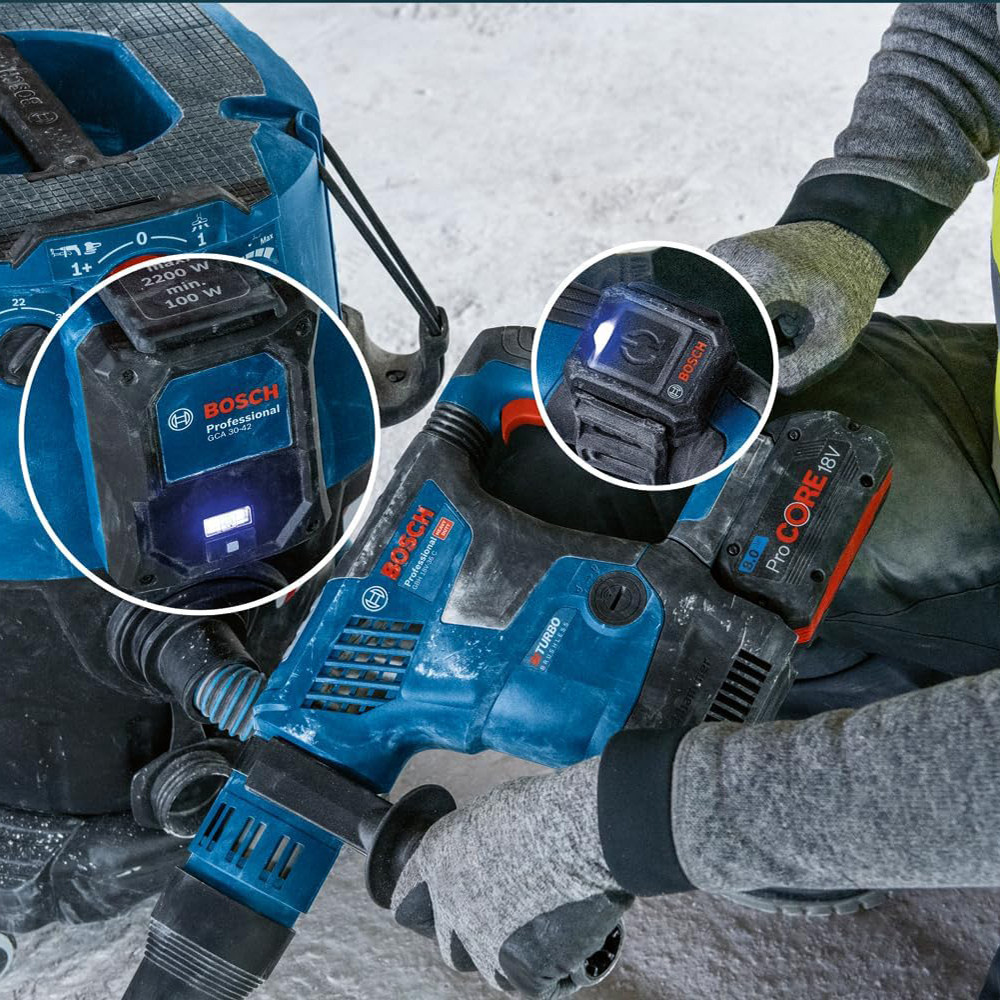Csak az autóindító készletünkre van szüksége. Tartalmazza a GCA 30-42 Professional automatikus indítási csatlakozót és a GCT 30-42 Professional automatikus indítási modult. Egyszerűen csatlakoztassa az automatikus indítás modult a szerszámhoz, és dugja be az automatikus indítás csatlakozóját a porszívóba. A párosítás után az Auto-Start érzékeli a futó eszköz rezgéseit, és automatikusan be- és kikapcsolja a vákuumot. Az Auto-Start az Ön helyett működteti a porszívót, így Ön teljes mértékben a munkájára koncentrálhat. Ezenkívül energiát takarít meg, és nagyobb védelmet kínál, mivel a porszívó a szerszám kikapcsolása után néhány másodpercig tovább működik, hogy eltávolítsa az utolsó porszemet. Az automatikus indítás készlet kompatibilis a Bosch Professional portfólió nagy részével, valamint sok más, kereskedelemben kapható elektromos kéziszerszámmal és porszívóval. Autóindító készletünk a professzionális porelszívás fontos tartozéka, és minden alkalmazáshoz alkalmas - megkönnyítve a kemény munkát.