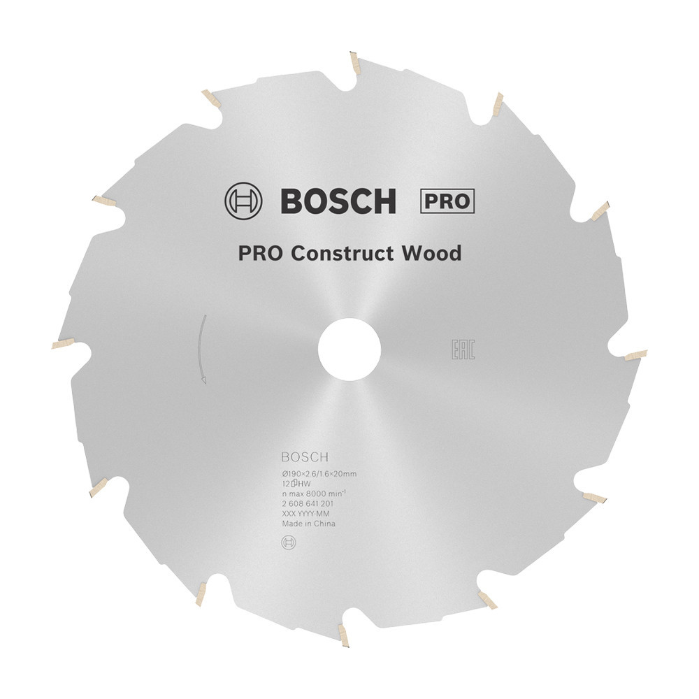 Bosch PRO Construct Wood körfűrészlap, 190x2,6x20 mm 12 fog, építőipari és szennyezett fához