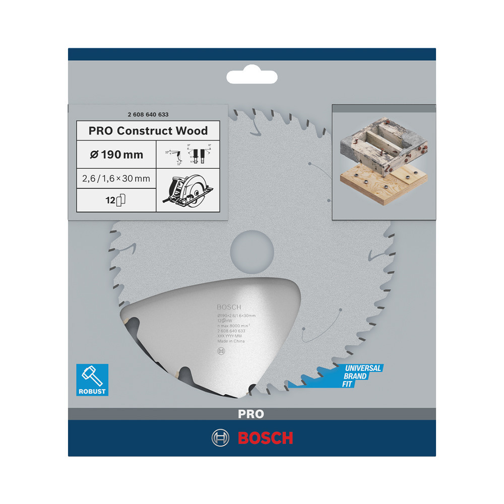 Bosch PRO Construct Wood körfűrészlap, 190x2,6x30 mm 12 fog, építőipari és szennyezett fához