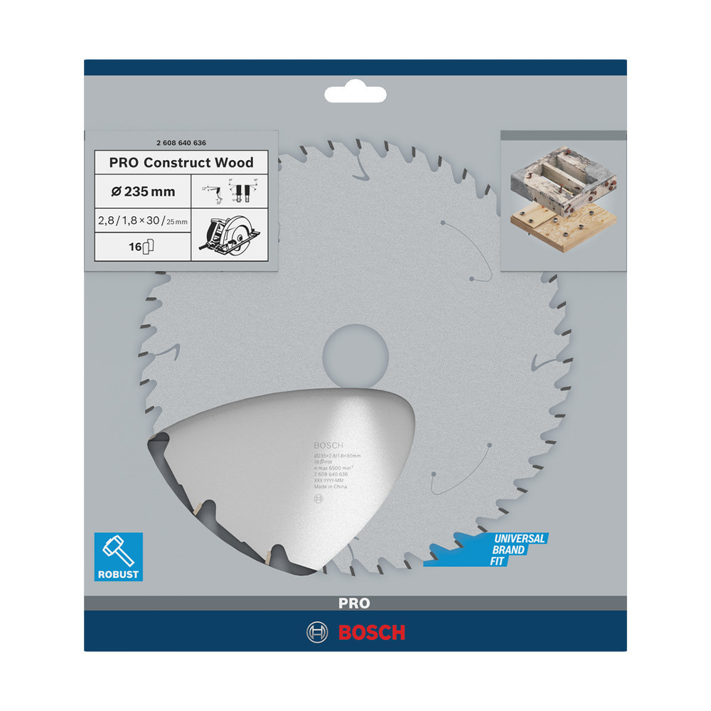 Bosch PRO Construct Wood körfűrészlap, 235x2,8x30 mm 16 fog, építőipari és szennyezett fához