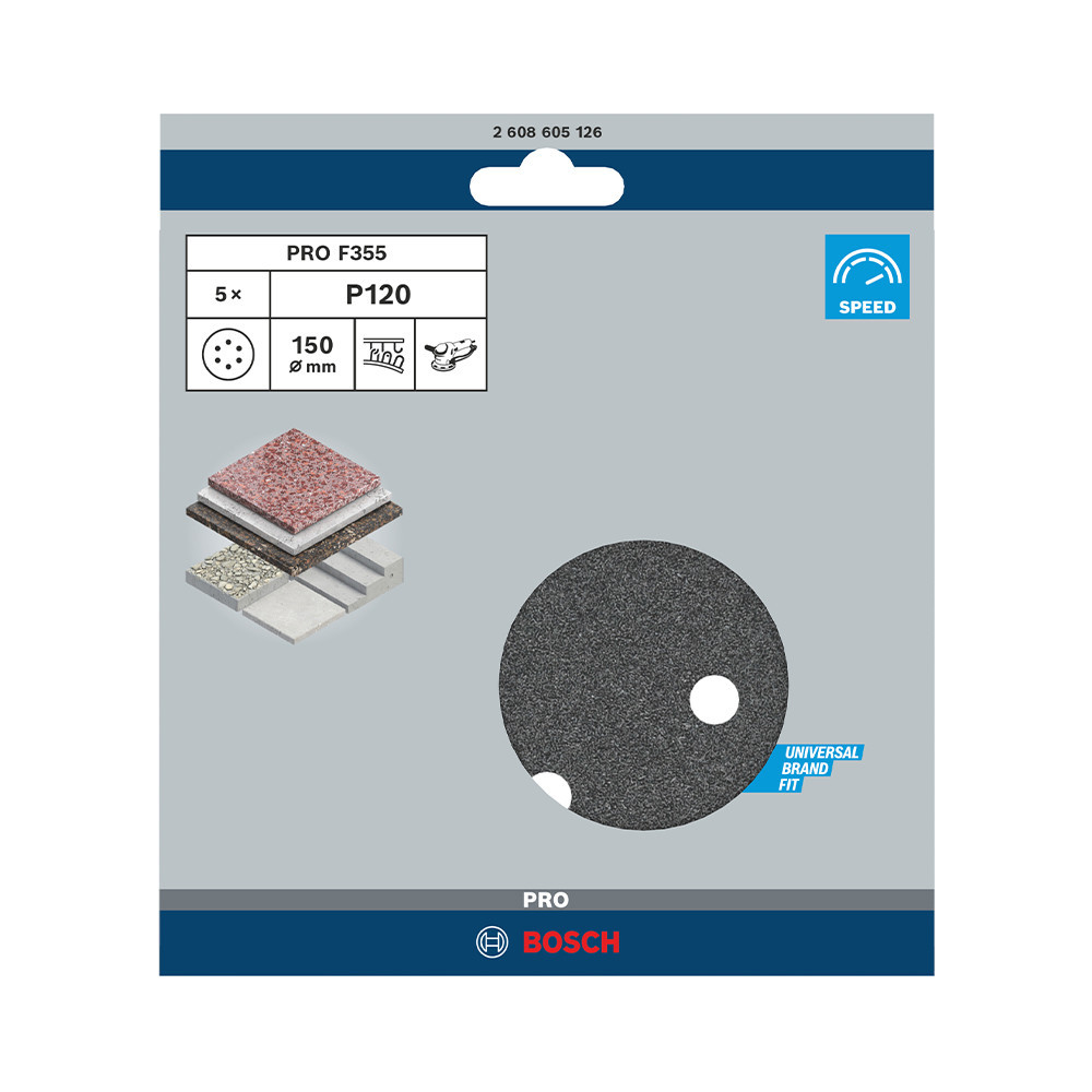 Bosch PRO F355 csiszolópapír, 150 mm, G120 tépőzáras, műanyag, üveg, beton, kő, WPC 5 db