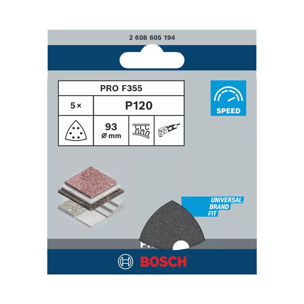 Bosch PRO F355 csiszolópapír, 93 mm, G120 tépőzáras, műanyag, üveg, beton, kő, WPC 5 db