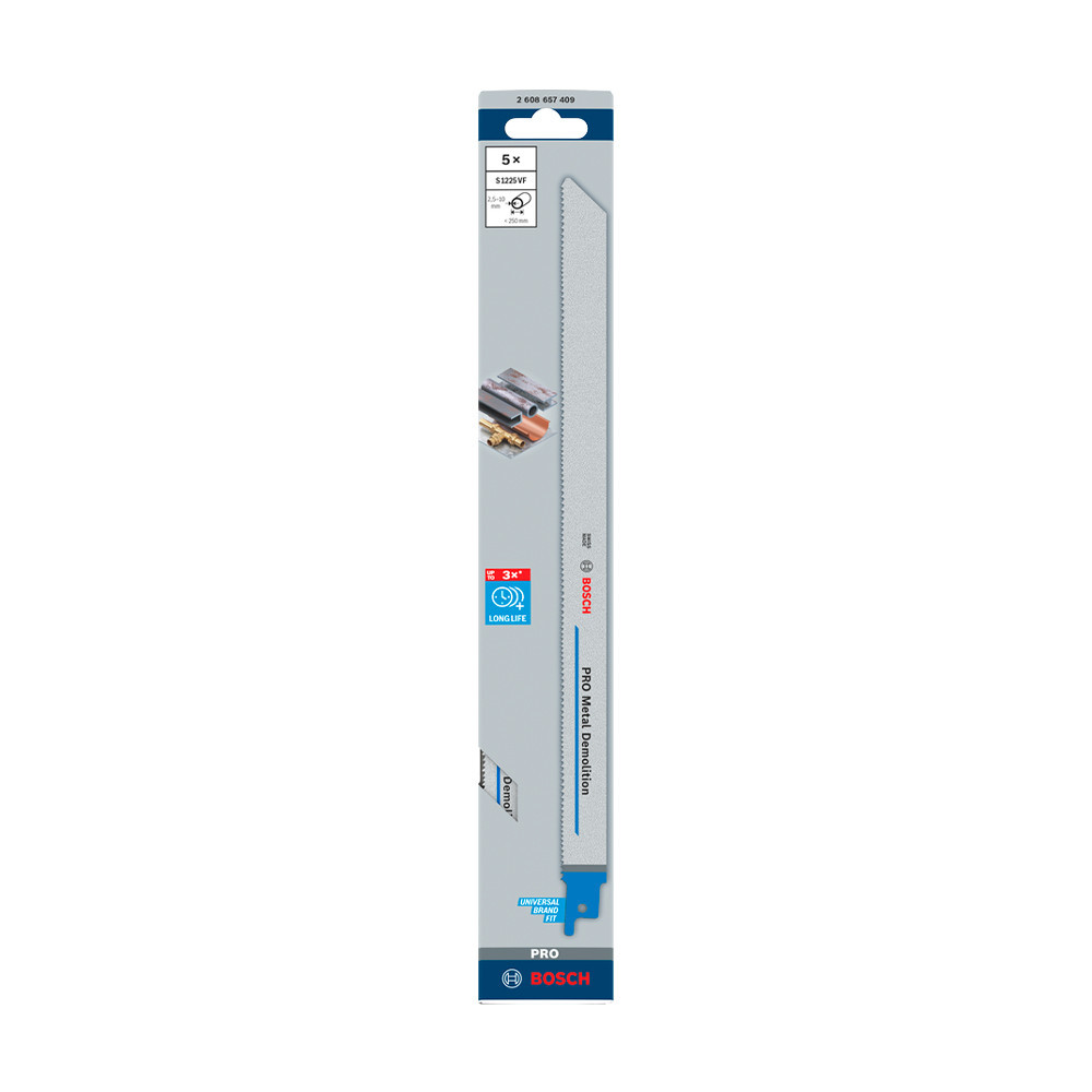 A PRO Metal Demolition S1225VF szablyafűrészlap robusztussága a bimetál felépítésnek köszönhető, amely a vastag HCS-testet edzett HSS fogakkal ötvözi. A továbbfejlesztett Bosch Vario fogkialakítás hatékonyabb vágást biztosít a zökkenőmentes munkavégzés és a hosszú élettartam érdekében. Az alábbi anyag(ok)hoz ajánlott: fémcsövek és -profilok, nemvasfémek