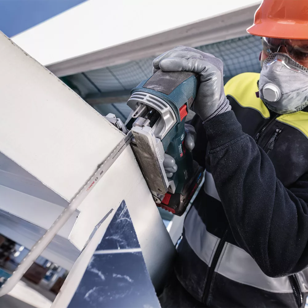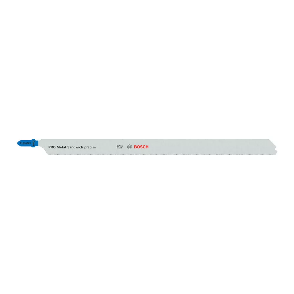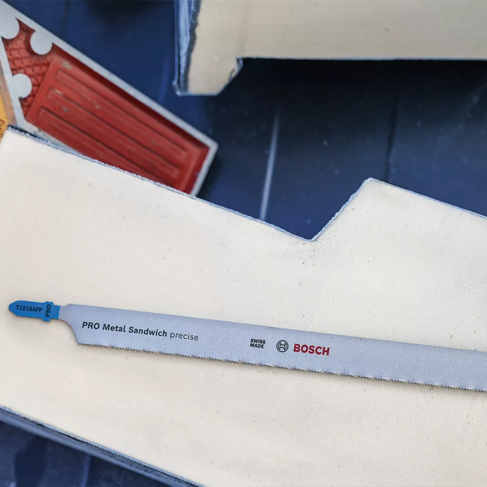 A PRO Metal Sandwich precise T1018AFP szúrófűrészlap bimetál kialakításának köszönheti erejét és rugalmasságát: hajlékonyabb, magas széntartalmú acélra (HCS) rögzített gyorsacél (HSS) fogazattal rendelkezik. A fűrészlapot vastagabbra készítettük: nehezen hajlítható, és precíz, egyenes vágást biztosít a kívánt szögben. Mart, hullámos, finom osztású fogazata segítségével könnyedén és tisztán vághatod vele a fém szendvicspaneleket. Megnövelt hossza lehetővé teszi, hogy akár 150 mm vastag munkadarabokat is vághass a fűrészlappal. A Bosch GST 150 és 160 szúrófűrészekhez ajánljuk. Az alábbi anyag(ok)hoz ajánlott: fém szendvicslemez