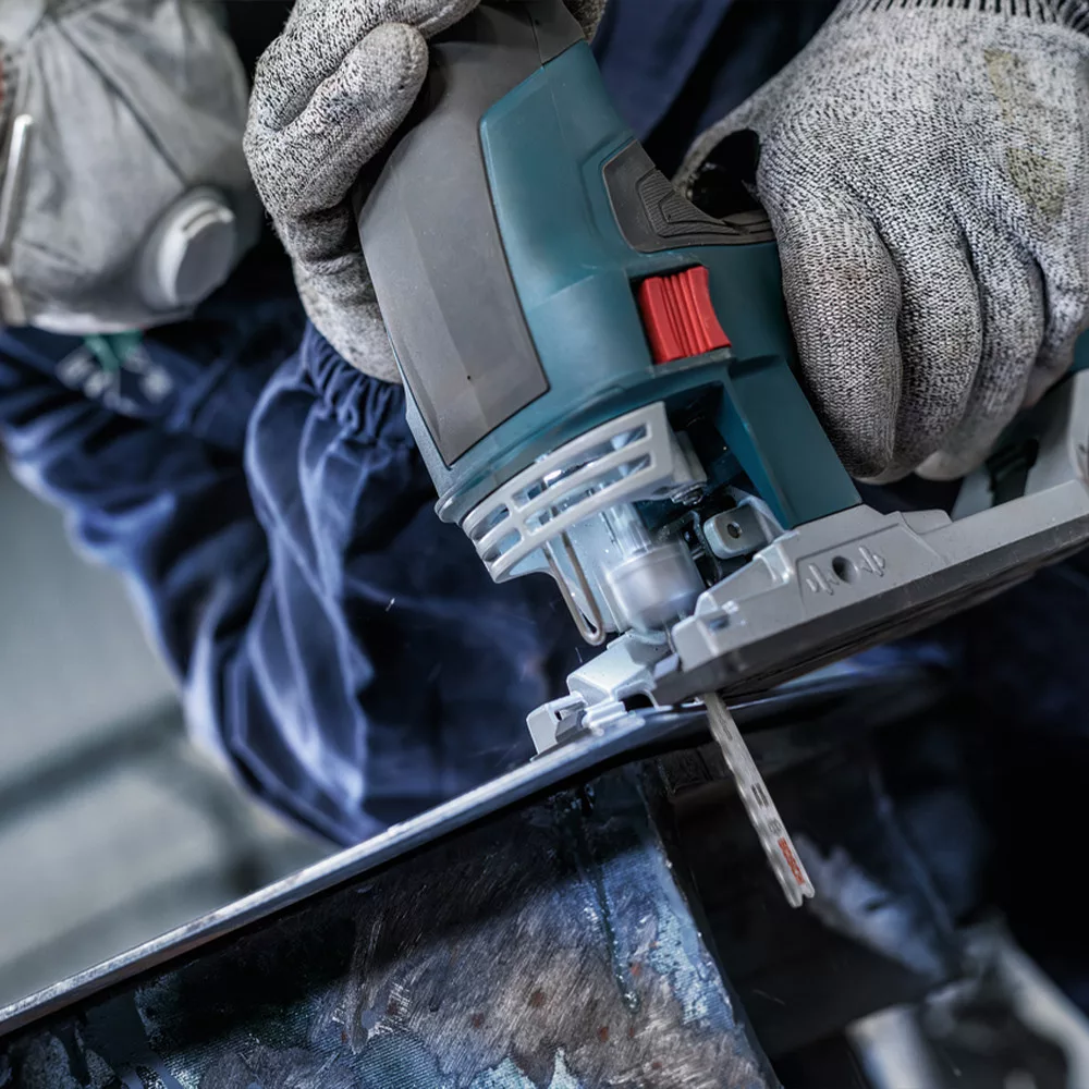A PRO Metal medium T121AFC szúrófűrészlap bimetál szerkezetű: alumínium-titán-nitrid (AlTiN) bevonattal rendelkező gyorsacél (HSS) fogazata nagy széntartalmú acél (HCS) testhez van kötve a szilárdság és tartósság érdekében. A fűrészlap foggeometriája – mélyen mart, hullámos fogazat –, valamint kúpos teste és a vékony alaptest sima vágásmenetet biztosít. 1 és 3 mm közötti vastagságú, közepes vastagságú és vékony fémlemezeket vághatsz vele. Az alábbi anyag(ok)hoz ajánlott: acéllemezek