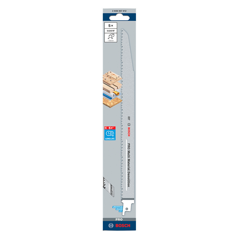 A PRO multi Material Demolition S1210VF szablyafűrészlap robusztussága a bimetál felépítésnek köszönhető, amely a vastag HCS-testet edzett HSS fogazattal ötvözi. A továbbfejlesztett Bosch Vario fogkialakítás hatékonyabb vágást biztosít a gyorsaság és a hosszú élettartam érdekében. Az alábbi anyag(ok)hoz ajánlott: szegelt deszka, szerkezeti faanyag, műanyagok, faforgácslap