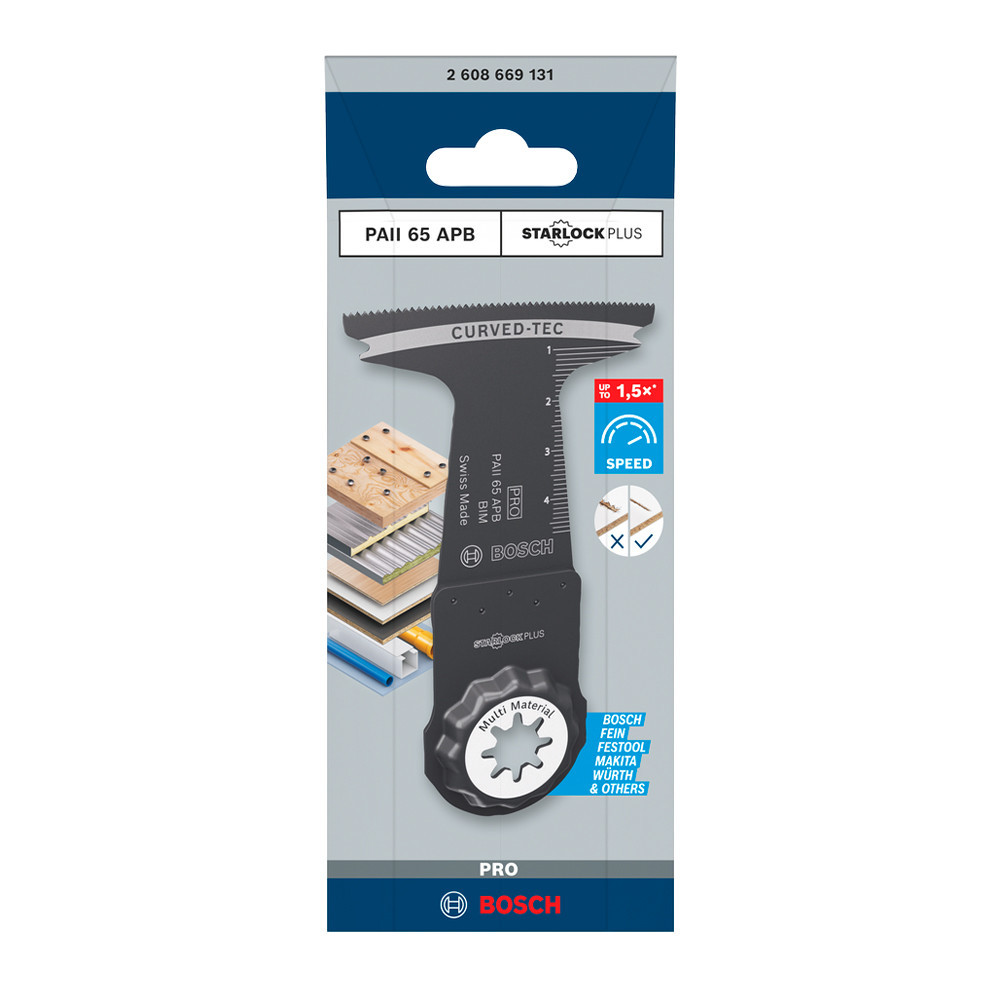 A PRO PAII 65 APB merülőfűrészlap a szilárdság és a tartósság érdekében bimetál szerkezetű. Curved-Tec kialakítása ideális a szakadásmentes merülővágásokhoz, megnövelt hossza pedig gyorsabb vágást és maximális hatékonyságot biztosít a munkaterületen. Az alábbi anyag(ok)hoz ajánlott: szegelt deszka, fém szendvicslemez, műanyag bevonatú lapok, műanyagok
