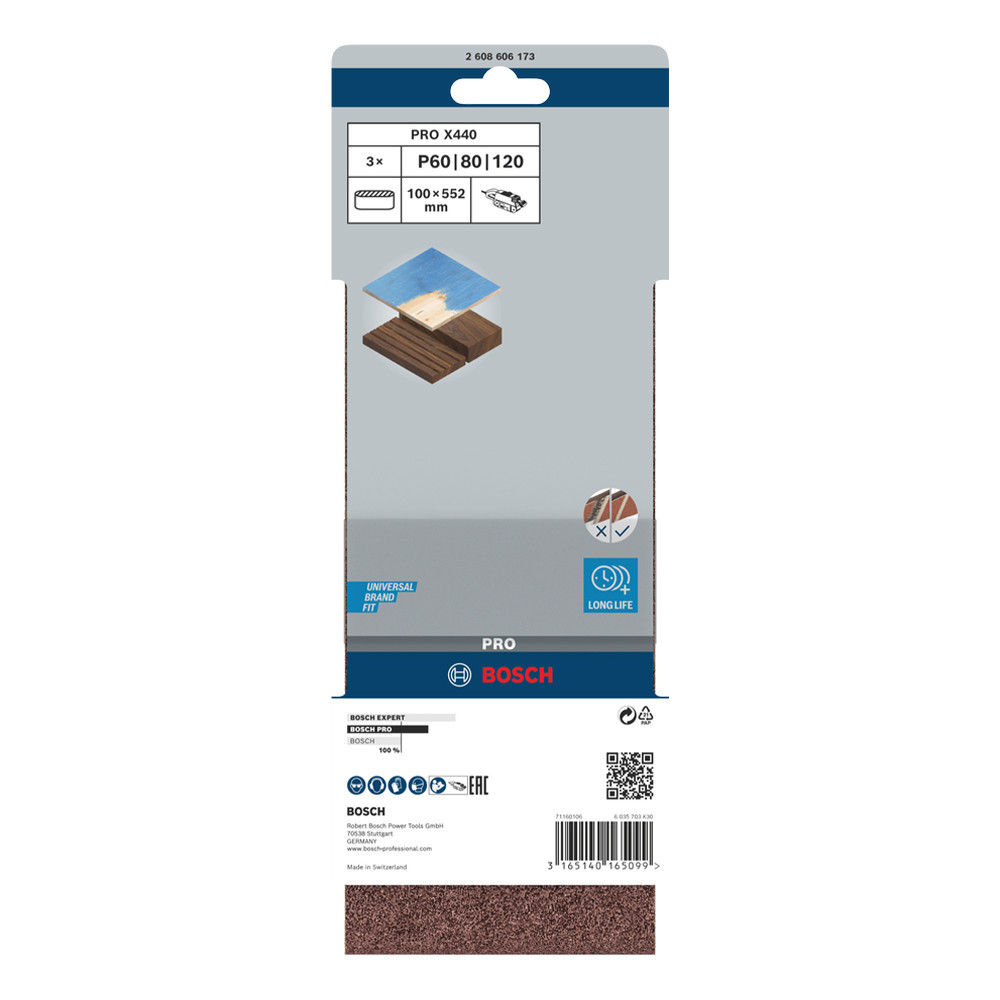 Bosch PRO X440 csiszolószalag, 100x552 mm, G60, G80, G100, 3 részes, fa, festék