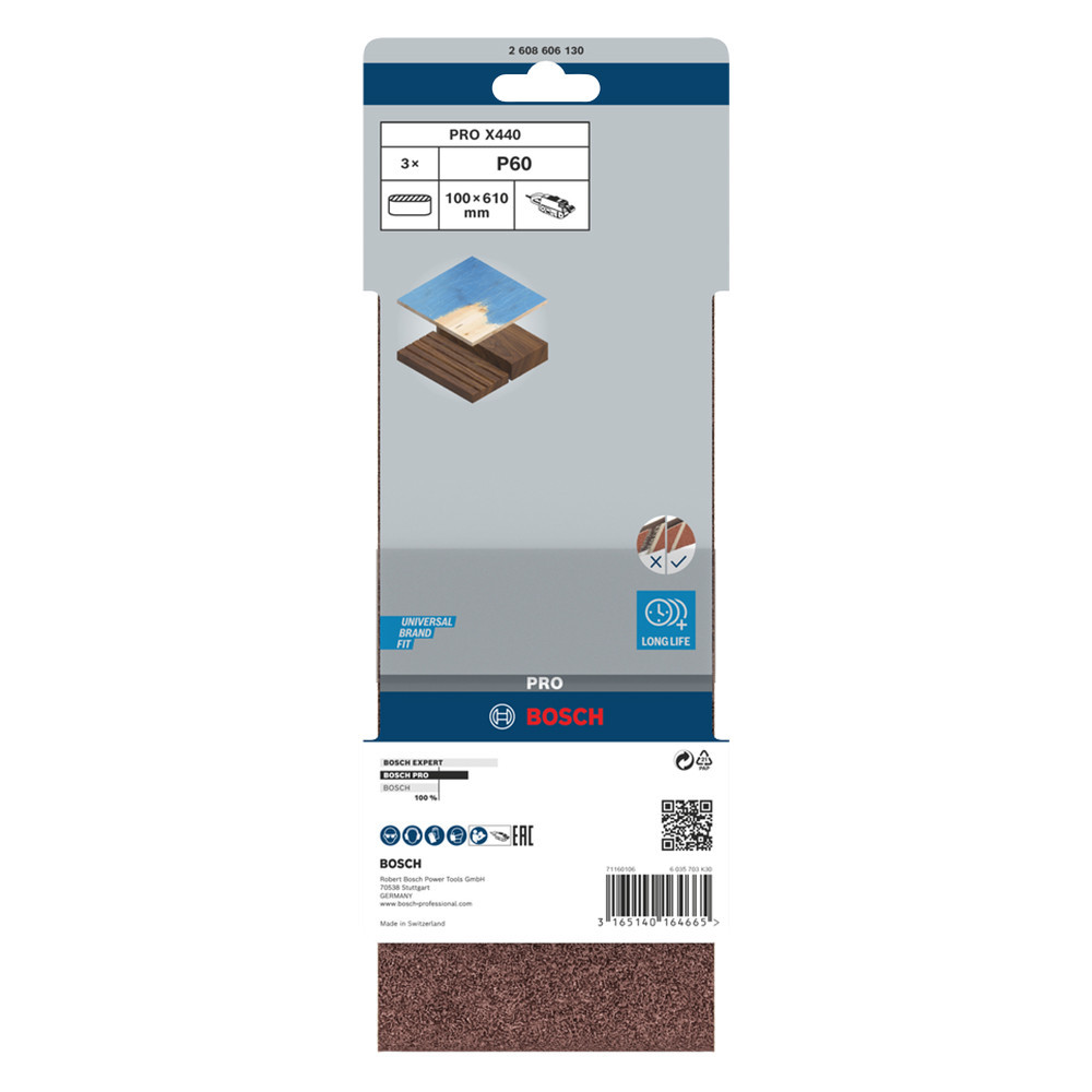 Bosch PRO X440 csiszolószalag, 100x610 mm, G60 3 db, keményfa, tömörfa, festék