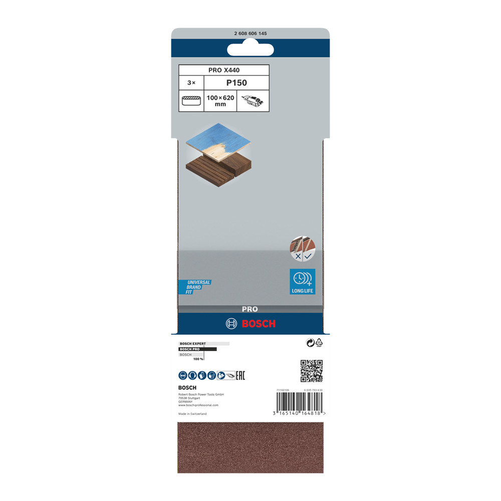 Bosch PRO X440 csiszolószalag, 100x620 mm, G150 3 db, keményfa, tömörfa, festék