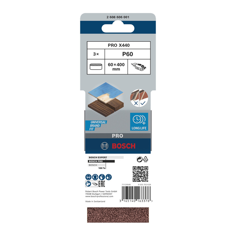 Bosch PRO X440 csiszolószalag, 60x400 mm, G60 3 db, keményfa, tömörfa, festék