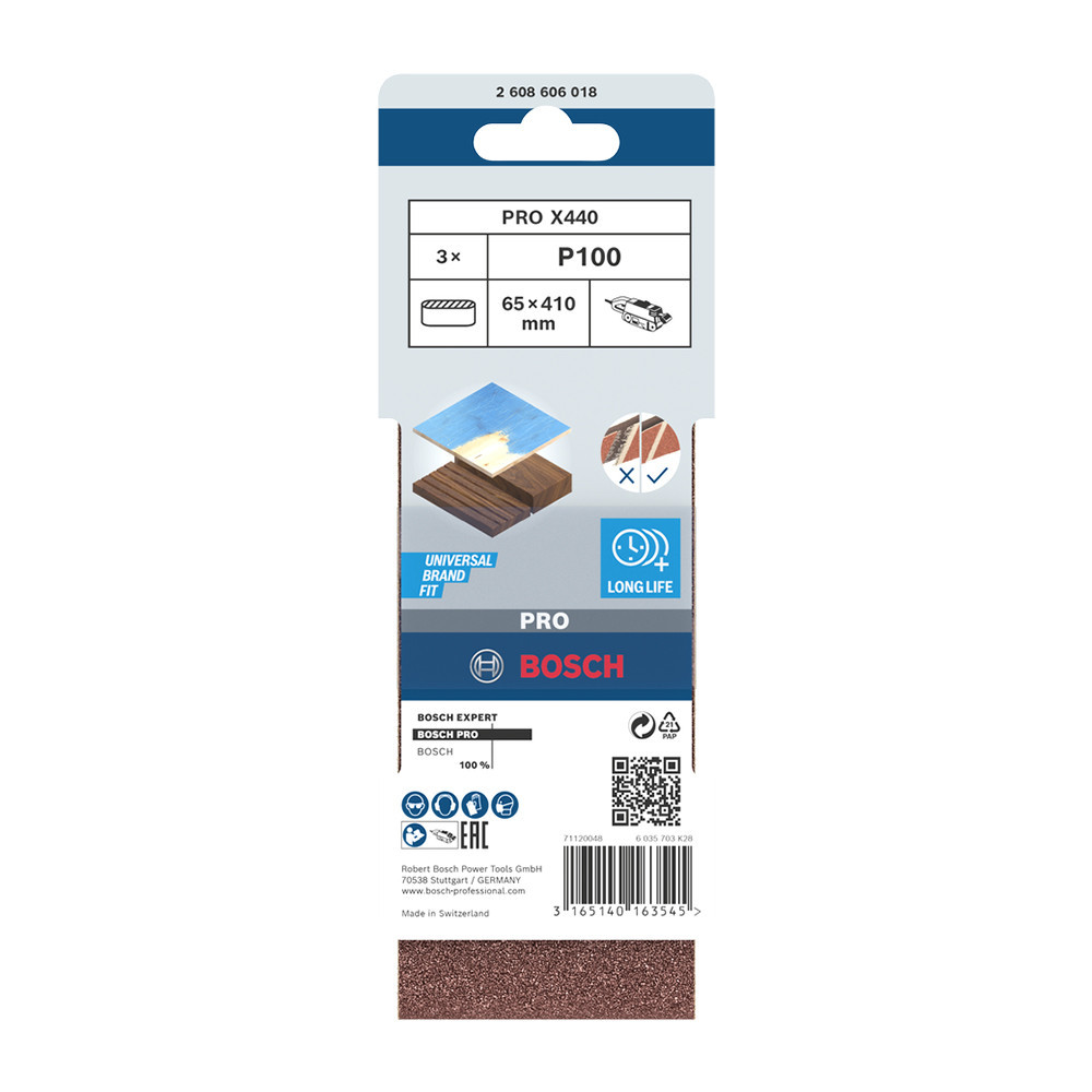 Bosch PRO X440 csiszolószalag, 65x410 mm, G100 3 db, keményfa, tömörfa, festék
