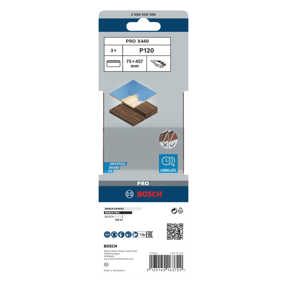 Bosch PRO X440 csiszolószalag, 75x457 mm, G120 3 db, keményfa, tömörfa, festék