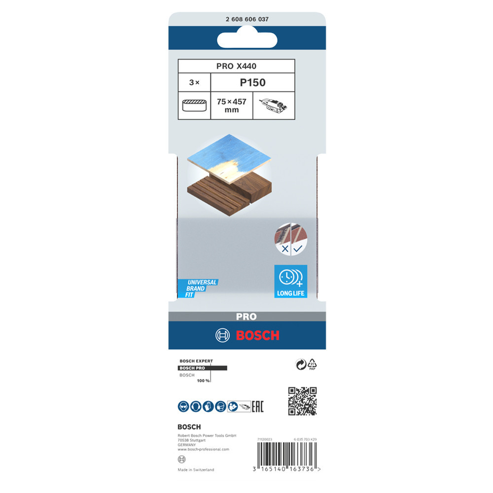 Bosch PRO X440 csiszolószalag, 75x457 mm, G150 3 db, keményfa, tömörfa, festék