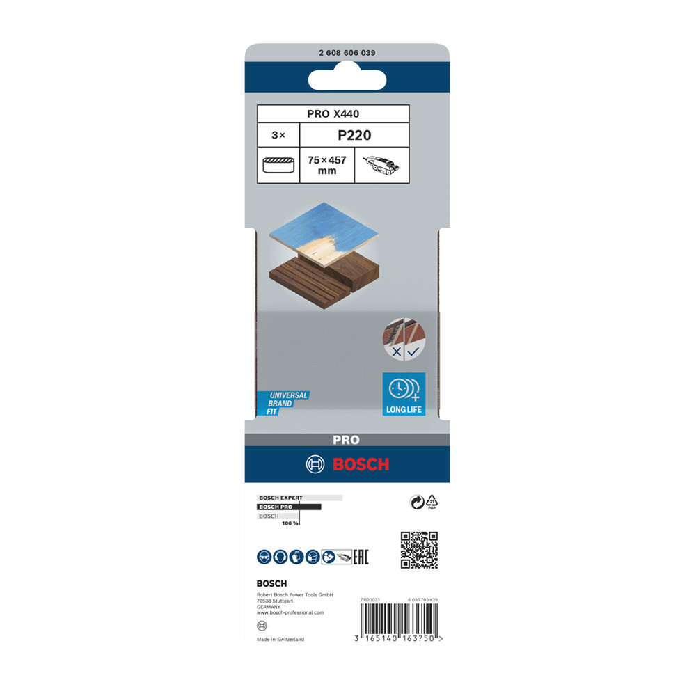 Bosch PRO X440 csiszolószalag, 75x457 mm, G220 3 db, keményfa, tömörfa, festék