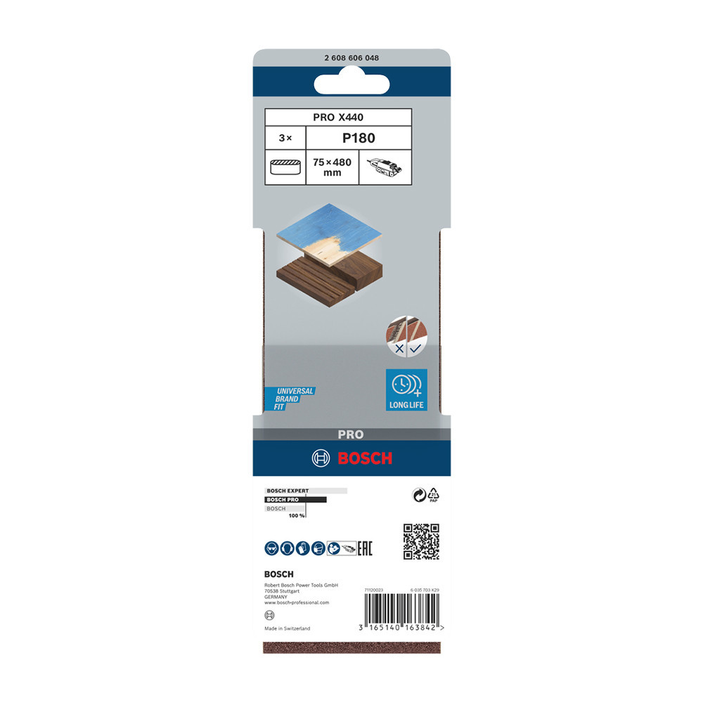 Bosch PRO X440 csiszolószalag, 75x480 mm, G180 3 db, keményfa, tömörfa, festék
