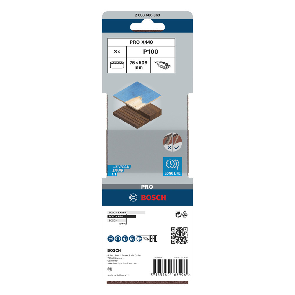 Bosch PRO X440 csiszolószalag, 75x508 mm, G100 3 db, keményfa, tömörfa, festék