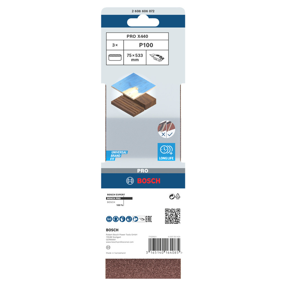 Bosch PRO X440 csiszolószalag, 75x533 mm, G100 3 db, keményfa, tömörfa, festék
