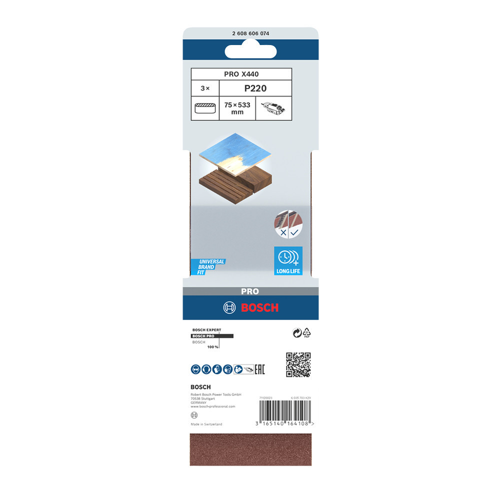 Bosch PRO X440 csiszolószalag, 75x533 mm, G220 3 db, keményfa, tömörfa, festék