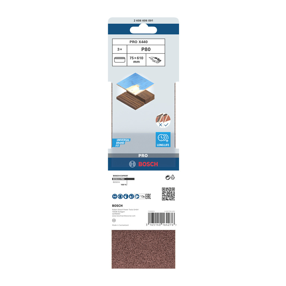 Bosch PRO X440 csiszolószalag, 75x610 mm, G80 3 db, keményfa, tömörfa, festék