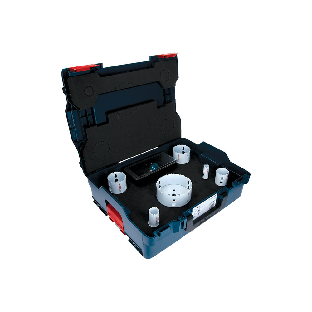 A Bosch Progressor lyukfűrészkészlete hat lyukfűrészt, egy 11 mm-es Power-Change Plus hatszögletűt és egy középfúrót tartalmaz