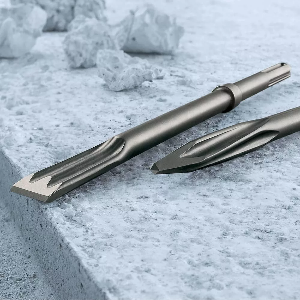 A PRO SDS max-5C bordázott kialakítása révén a véső oldalirányú és függőleges repedéseket hoz létre a megmunkálandó anyagban. Ez segít a vésés hatékonyabbá tételében, és megakadályozza, hogy a véső beleragadjon az anyagba. Az alábbi anyag(ok)hoz ajánlott: beton, tégla