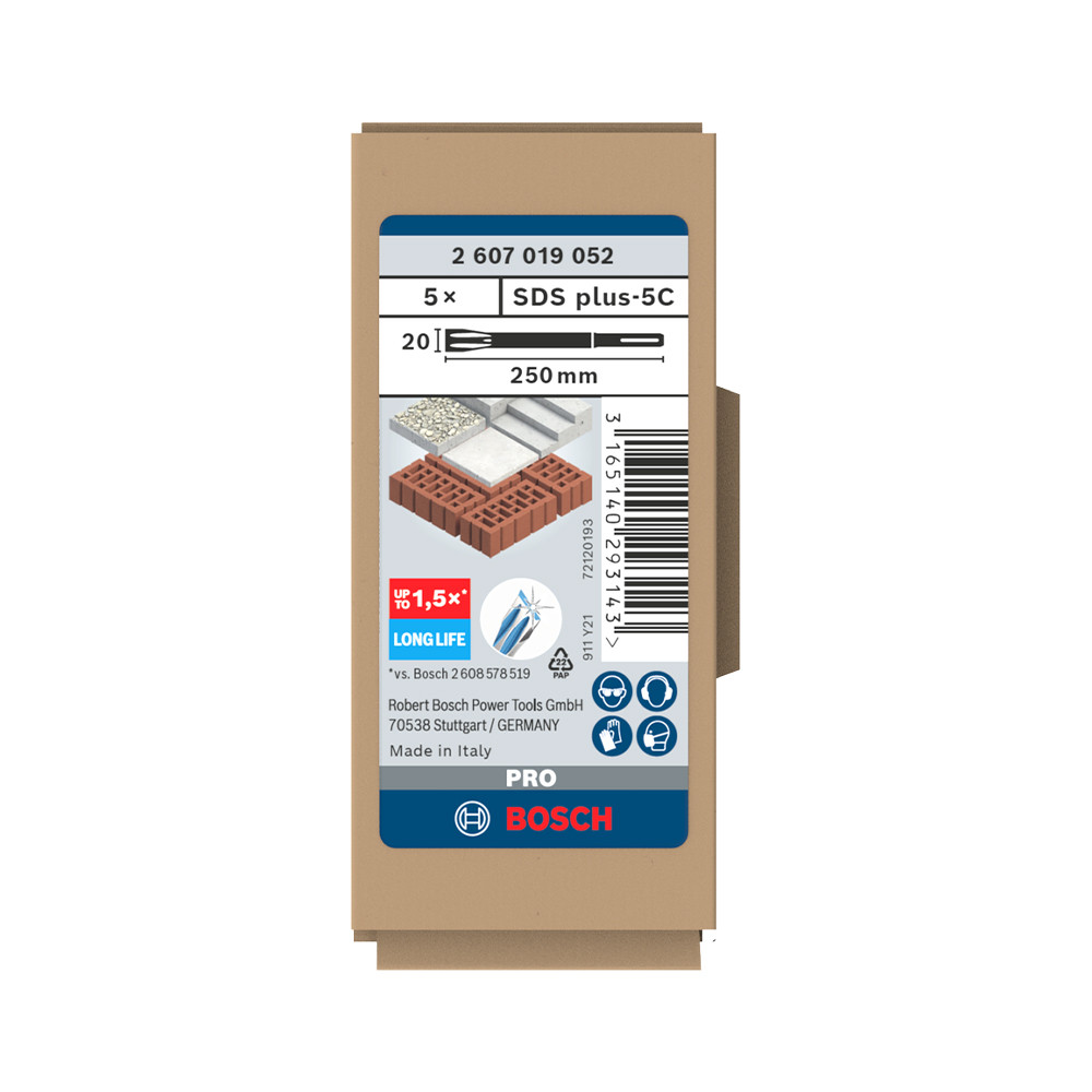 A PRO SDS plus-5C bordázott kialakítása biztosítja, hogy a véső oldalirányú és függőleges repedéseket hozzon létre a megmunkálandó anyagban. Ez segít a vésés hatékonyabbá tételében, és megakadályozza, hogy a véső beleragadjon az anyagba. Az alábbi anyag(ok)hoz ajánlott: beton, tégla