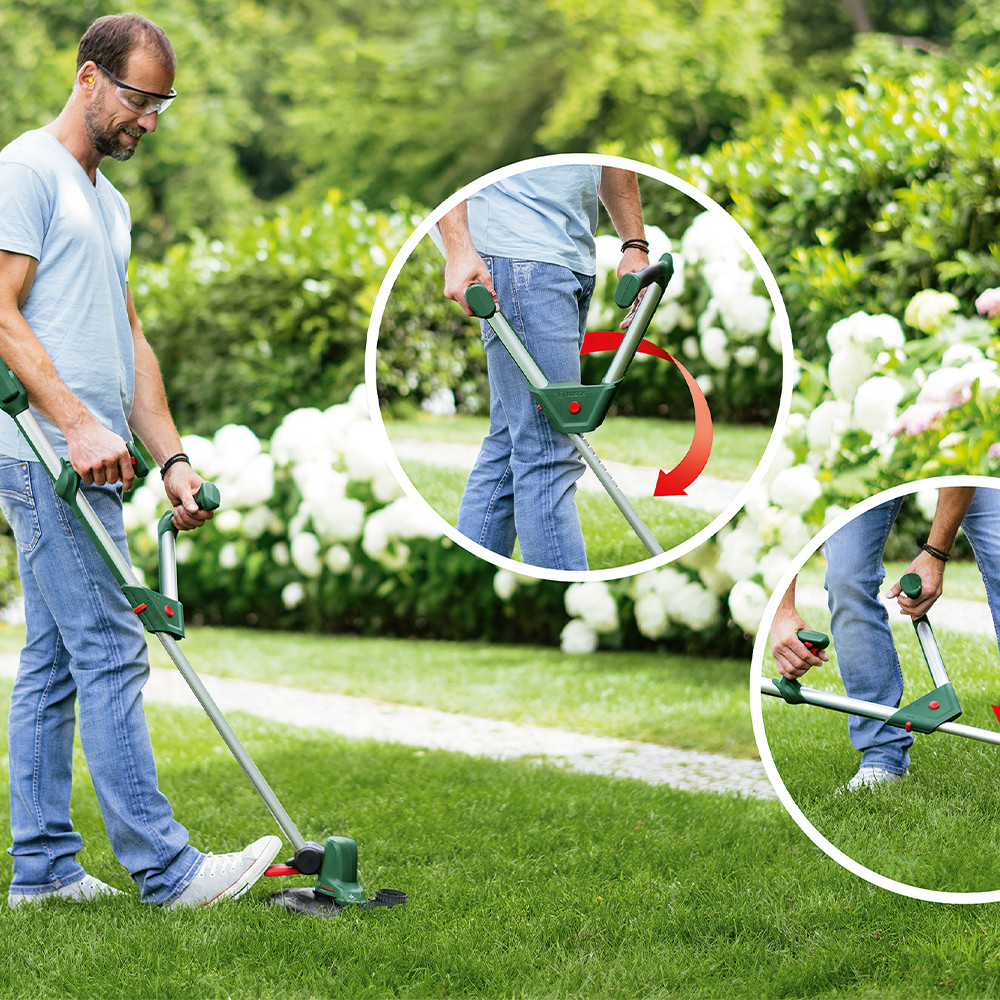 Ergonomikus V-alakú fogantyú a kényelmes munkavégzésért A sokoldalú fejnek köszönhetően kéz nélkül dönthet a fej és állítható be a szegélynyíró IntelliFEED funkcióval automatikusan adagolja a vágószálat