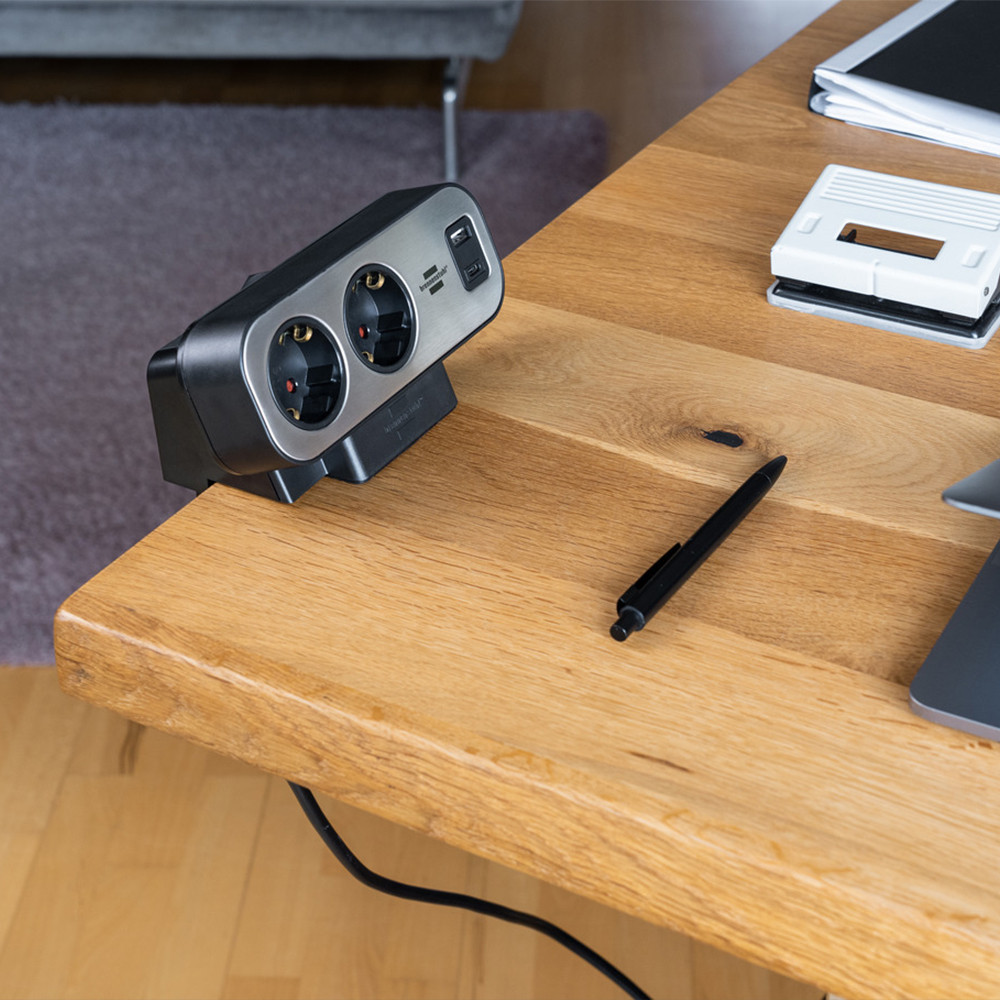 Innovatív, kétrészes kialakítású asztali konnektorcsík megvilágított, kétpólusú biztonsági kapcsolóval és praktikus szorítófunkcióval az optimális áramellátás érdekében az otthoni irodában vagy a munkahelyen