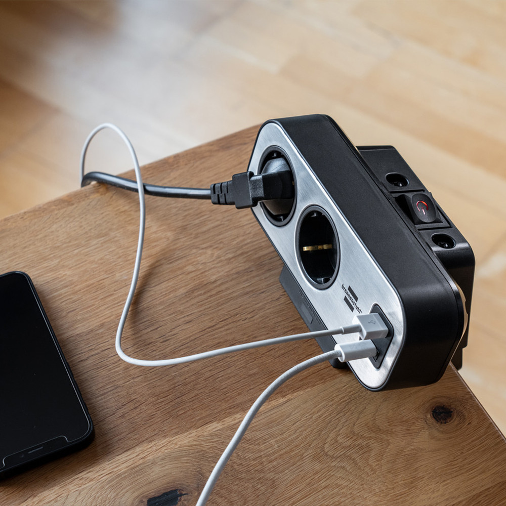 A kiváló minőségű rozsdamentes acél felülettel rendelkező kompakt asztali egység két konnektorral és 1x USB C kimenettel max. 30W-os gyors töltéshez és 1x USB A kimenettel max. 18W-os töltéshez a felső oldalon