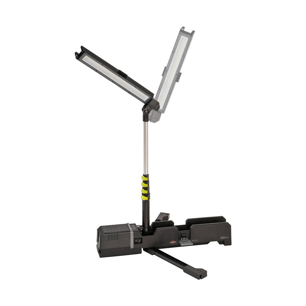 Az akkumulátoros munkalámpa rugalmasan állítható a stabil állványnak köszönhetően, amely állvány és állítható magasságú teleszkóp segítségével állítható (1,40 m-ig kihúzható) - a dönthető és elforgatható reflektorfej tökéletes területvilágítást biztosít