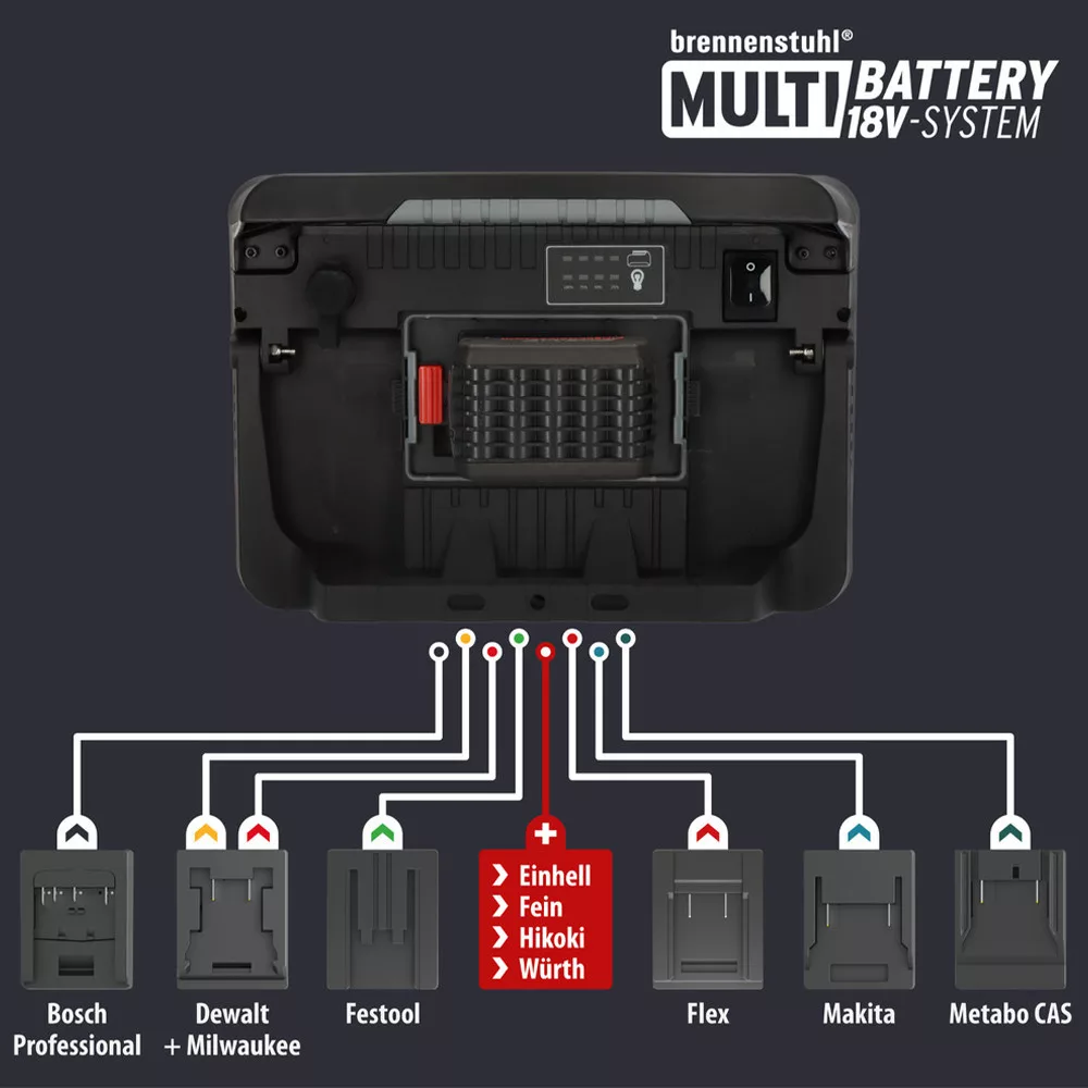 Kompatibilis a következő 11 elektromos szerszámgyártó különböző 18 V-os akkumulátorával (különböző Ah osztályok): Bosch Professional, Dewalt, Einhell, Fein, Festool, Flex, Hikoki, Makita, Metabo CAS, Milwaukee és Würth.