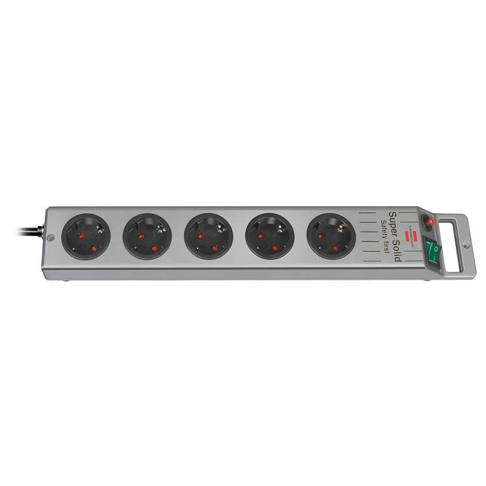 A Brennenstuhl Super-Solid 5er többszörös aljzatkapcsoló szalagja fekete/ezüst színben és 2,5 m-es kábellel minden téren lenyűgöz minőségével és biztonságával. A kapcsolóval szemben található speciális kábelbevezetésnek köszönhetően ez a hálózati csatlakozó különösen megkönnyíti az üzemeltetést, például az íróasztal alatt. Nemcsak a véletlen érintés elleni fokozott védelemmel rendelkezik, hanem a következő tulajdonságokkal is meggyőző: