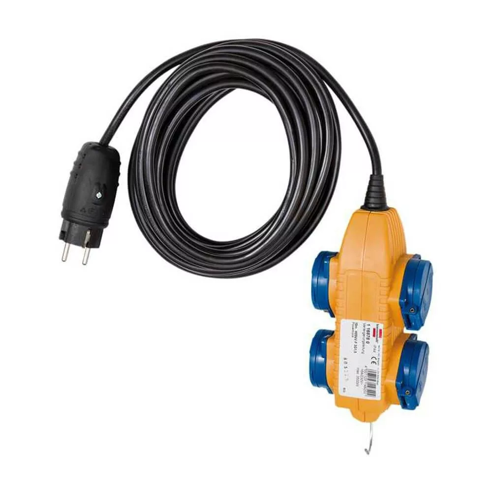 Hosszabbító- vezeték földelt dugaljjal és rászerelt 4- szeres dugalj- powerblokkal, ütés- és törésbiztos.