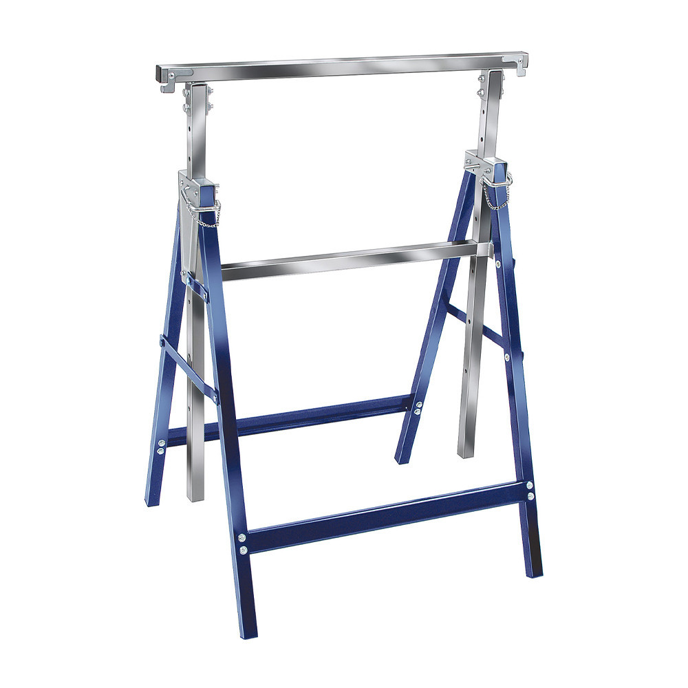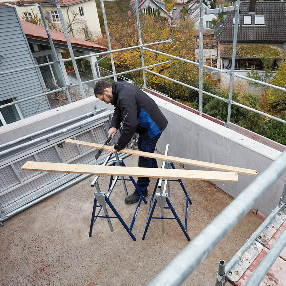 A masszív és stabil négyszögletes acélcsőből készült összecsukható állvány ütés- és karcálló, és a kihajtható bepattanó kampóknak köszönhetően megakadályozza a munkafelület lecsúszását - ideális feltételek a biztonságos és optimális munkavégzéshez