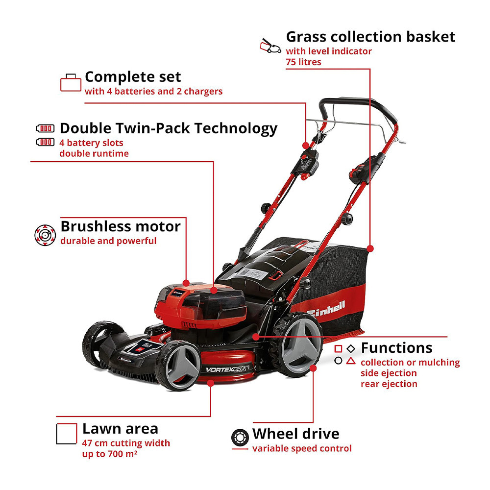 Az Einhell GP-CM 36/47 S HW Li akkumulátoros fűnyíró nélkülözhetetlen segítőtárs a kert szerelmesei számára. Nem kell többé a fáradságos és sokszor bizony nehézkes berántós indítással fáradnia. Sőt! Mostantól elfelejtheti a kábelekkel járó bajlódást, és attól sem kell tartania, hogy orra bukik a hosszabbítókábelben: bízza magát a Power X-Change akkumulátorokra, és tapasztalja meg a határtalan szabadságot!