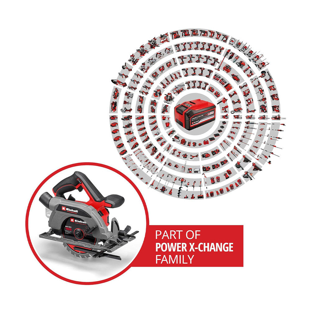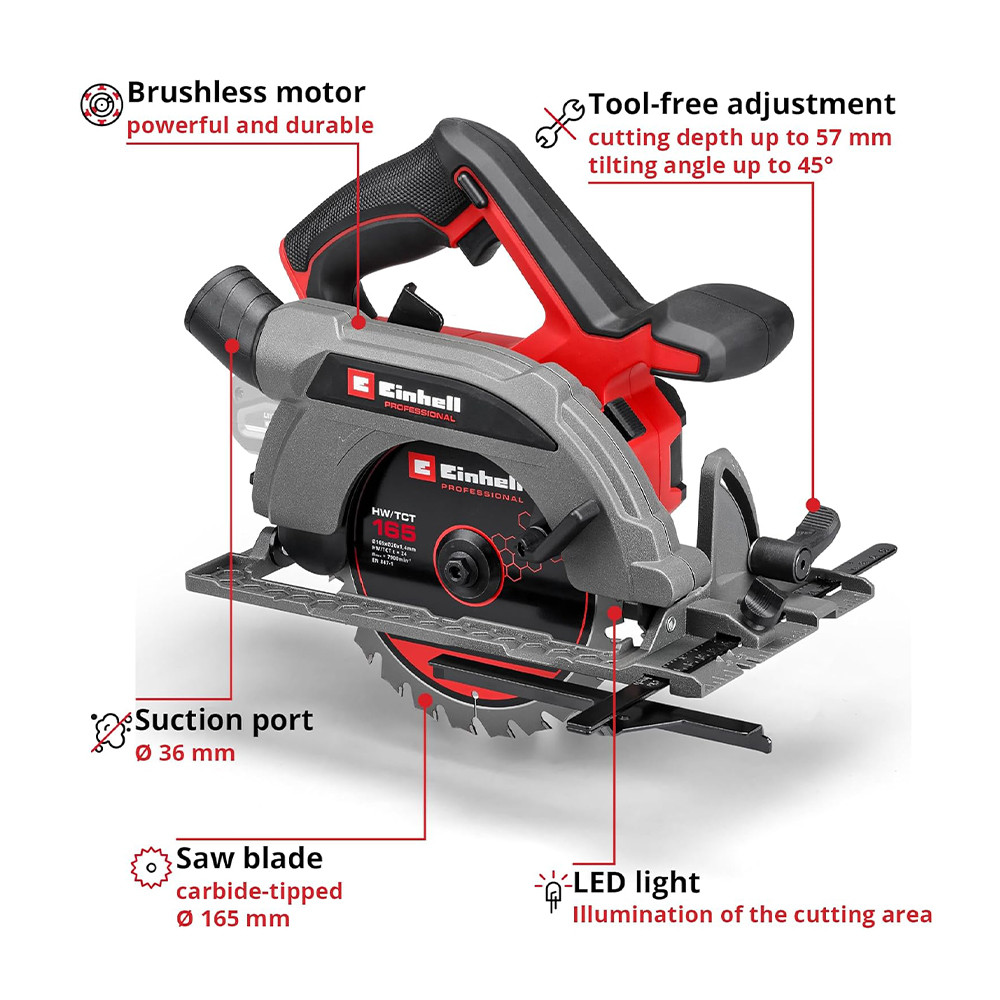 Az Einhell Professional TP-CS 18/165 Li BL - Solo akkus kézi körfűrész TP-CS 18/165 Li BL - Solo rendkívül kompakt és praktikus, és kellemes munkát tesz lehetővé a műhelyben és a kertben