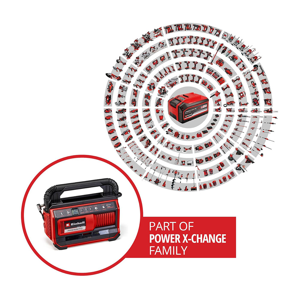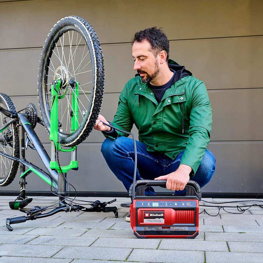 Az Einhell PRESSITO 18/25 hybrid hibrid kompresszor sosem fogy ki a levegőből: A nagy teljesítményű Power X-Change család tagjaként a kompresszor otthon hálózati kábellel, vagy útközben egy 18 voltos Power X-Change akkumulátorral üzemeltethető