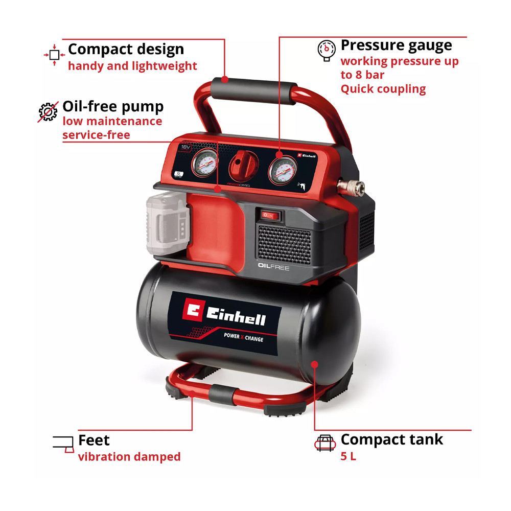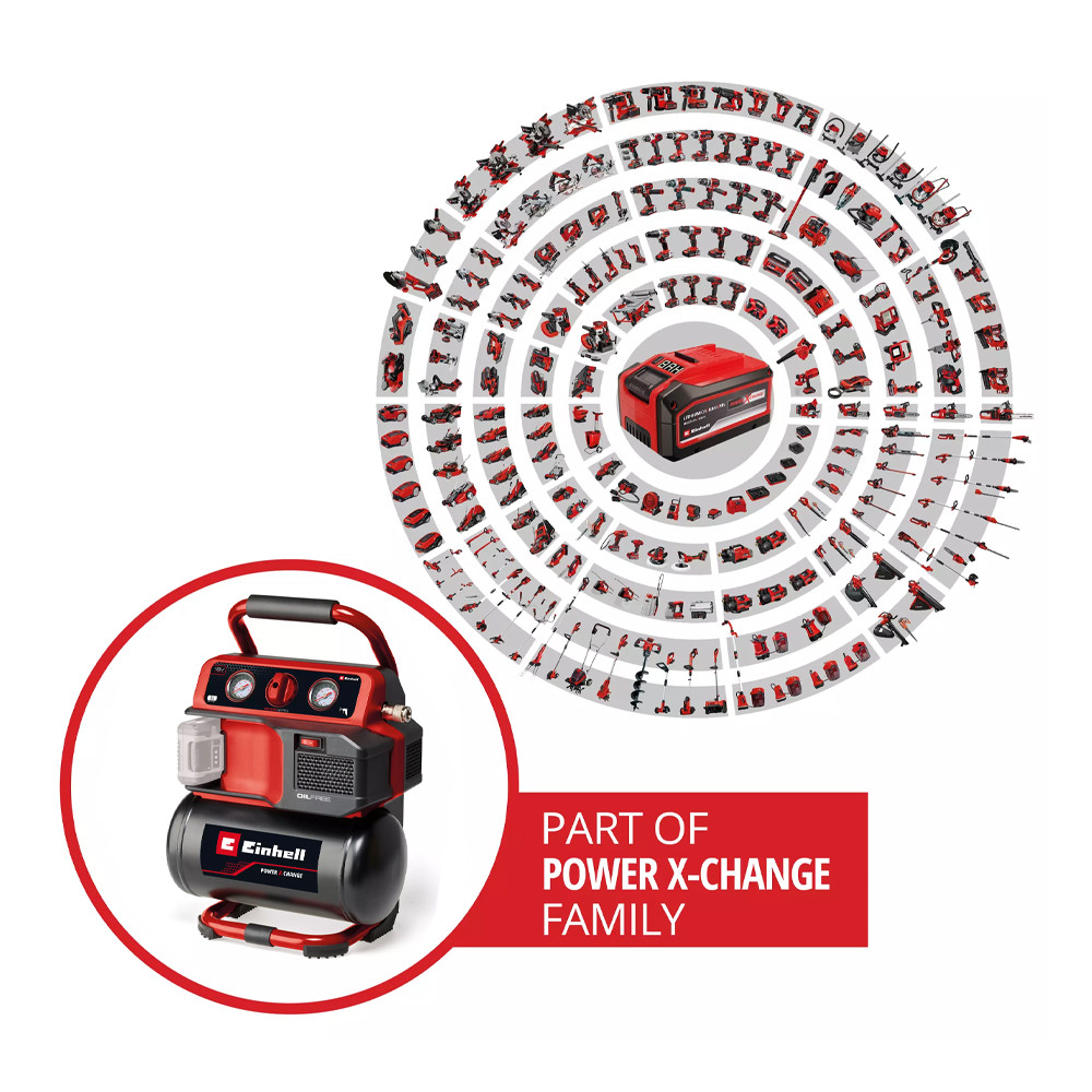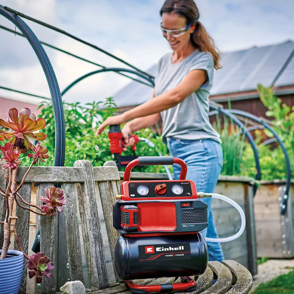 Az Einhell TE-AC 18/75 Li OF-Solo akkus kompresszorral nem fogsz könnyen kifogyni a levegőből, legyen szó akár a műhelyről, akár a garázsról