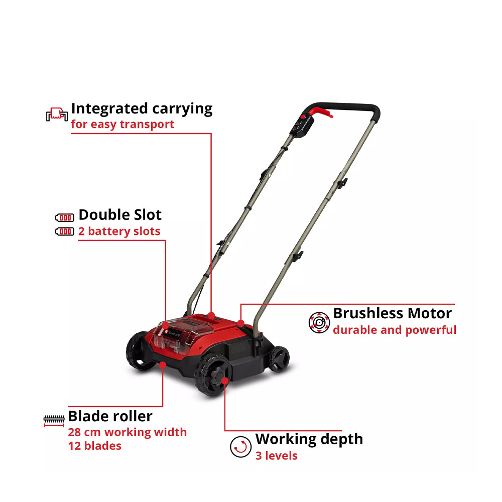 Az Einhell GC-SC 18/28 DS Li-Solo akkus talajlazító/gyepszellőztető akkumulátor és töltő nélkül kerül szállításra, külön rendelhető hozzá!