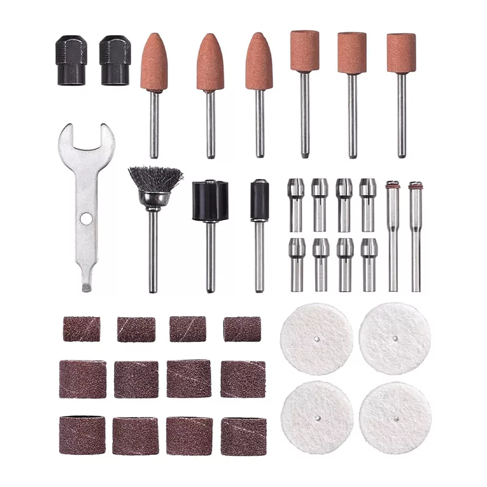 A készlet két befogóhüvely-készletet is tartalmaz, amelyek mindegyike 4 db befogóhüvelyt és 1 db szorítóanyát, 2 db befogótüskét, 2 db szorítóhüvelyt csiszolóhengerrel (13 x 13 mm) és 1 db villáskulcsot tartalmaz