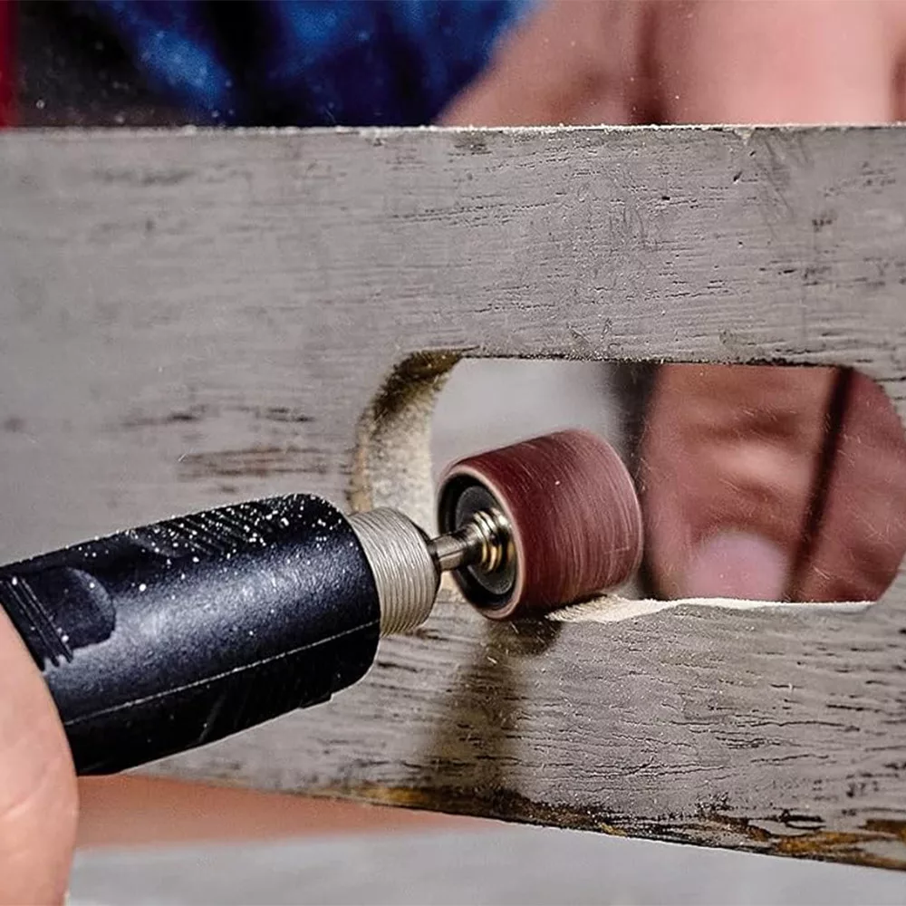 A szállítási terjedelemben található 12 csiszolóhenger-feltét 2 kisebb, K80 és K120 (6,35 x 13 mm) és 4 nagyobb, K80 és K120 csiszolóhengerből (13 x 13 mm) áll