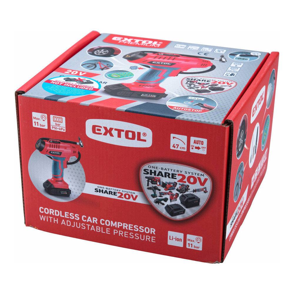 Erőteljes és nagy teljesítményű lítium-ion akkumulátoros kompresszor, amelynek rendeltetése a személygépkocsik és haszongépjárművek, motorkerékpárok és kerékpárok gumiabroncsainak nyomásának az ellenőrzése és növelése, valamint a mellékelt tartozékokkal a sportlabdák, ágyak, matracok stb. felfújása.